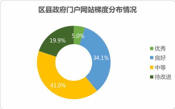 區(qū)縣級(jí)政府門(mén)戶網(wǎng)站中,13家網(wǎng)站位于“優(yōu)秀”梯度,89家位于“良好”梯度。區(qū)縣級(jí)政府門(mén)戶網(wǎng)站梯度分布情況如下: