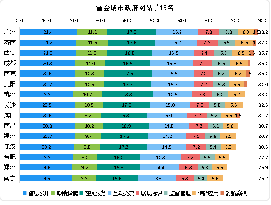 省會(huì)城市政府網(wǎng)站中,廣州、濟(jì)南和西安位列前三名,成都和南京并列第四名,貴陽(yáng)、杭州、長(zhǎng)沙、???、南昌分列六至十名,福州/武漢、合肥、鄭州和南寧分列十一至十五名。得分如下: