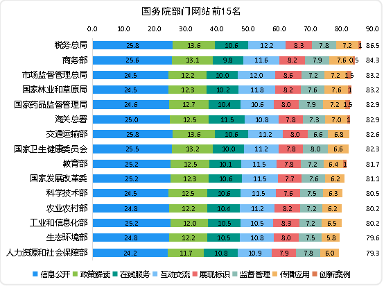 部委網(wǎng)站中,稅務(wù)總局和商務(wù)部位列前兩名,市場(chǎng)監(jiān)督管理總局和國(guó)家林業(yè)和草原局并列第三名,國(guó)家藥品監(jiān)督管理局和海關(guān)總署并列第五名,交通運(yùn)輸部、國(guó)家衛(wèi)生健康委員會(huì)、教育部、國(guó)家發(fā)展改革委、科學(xué)技術(shù)部、農(nóng)業(yè)農(nóng)村部/工業(yè)和信息化部、生態(tài)環(huán)境部、人力資源和社會(huì)保障部分列七至十五名。得分如下: