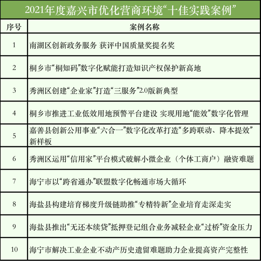 從嘉興市營(yíng)商辦獲悉,2021年度嘉興市優(yōu)化營(yíng)商環(huán)境“十佳實(shí)踐案例”在3月3日經(jīng)評(píng)選發(fā)布,旨在推廣一批可復(fù)制、可借鑒的優(yōu)化營(yíng)商環(huán)境改革創(chuàng)新舉措及服務(wù)企業(yè)案例,不斷提高我市營(yíng)商環(huán)境改革成效。
