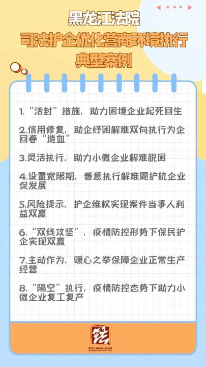 為全面貫徹落實黑龍江省委“能力作風建設年”及優(yōu)化營商環(huán)境專項行動的部署要求,推動兩項活動走深走實,黑龍江高院立足執(zhí)行工作職能,充分發(fā)揮執(zhí)行“三統(tǒng)一”管理優(yōu)勢,連續(xù)5年在全省組織開展“雷霆”執(zhí)行行動,助力中小微企業(yè)健康發(fā)展,有力服務保障“六?!薄傲€(wěn)”和“六個龍江”建設?,F(xiàn)從全省法院執(zhí)行案件中選取了8件司法護企優(yōu)化營商環(huán)境典型案例予以公布。
