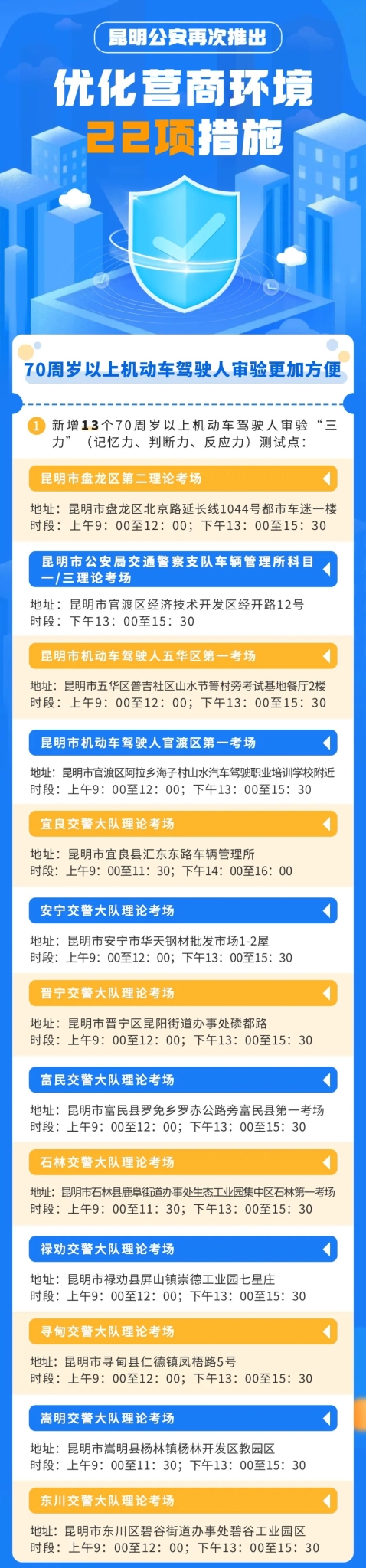 為深入推進“放管服”改革,優(yōu)化營商環(huán)境,當好全省優(yōu)化營商環(huán)境的“排頭兵”,最大限度方便群眾、企業(yè)辦事辦證,昆明市公安局在推出72項高頻政務(wù)服務(wù)事項和優(yōu)化營商環(huán)境33項措施的基礎(chǔ)上,按照“成熟一批、推出一批、上線運行一批”的方式,將陸續(xù)推出近百項高頻政務(wù)服務(wù)事項和便民利企措施。近日昆明市公安局圍繞車駕管、人口信息管理互聯(lián)網(wǎng)安全管理、出入境管理四個方面再次推出優(yōu)化營商環(huán)境22項措施。