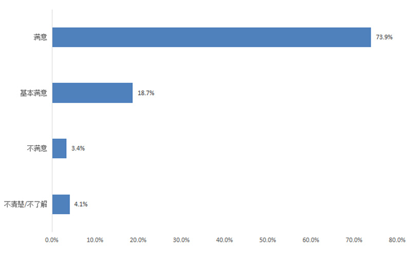調(diào)查結(jié)果顯示,企業(yè)對政府機(jī)關(guān)“執(zhí)行‘一站式辦理審批’,打造陽光便利的審批環(huán)境”的滿意度為92.6%,其中評價“滿意”的占73.9%,“基本滿意”的占18.7%,“不滿意”的占3.4%,“不清楚/不了解”的占4.1%。