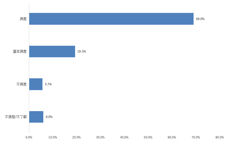 調(diào)查結(jié)果顯示,企業(yè)對所在地政府依法行政情況的滿意度為88.3%,其中評價“滿意”的占69.0%,“基本滿意”的占19.3%,“不滿意”的占5.7%,“不清楚/不了解”的占6.0%。