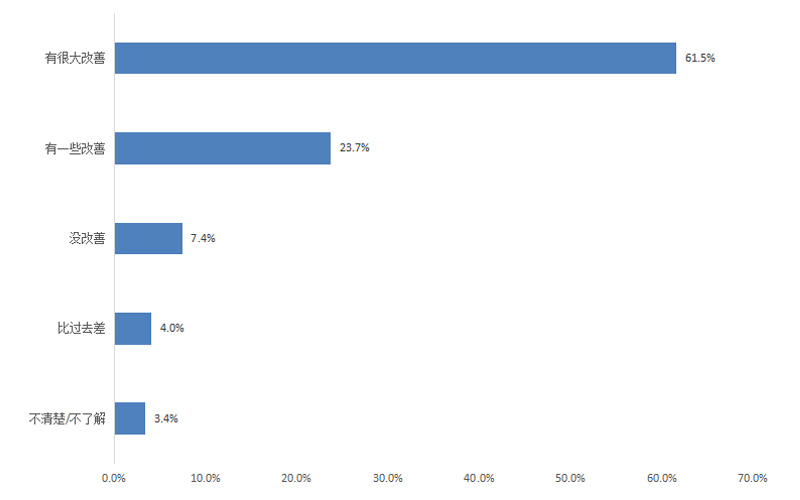 《遼寧省紀(jì)委監(jiān)委營商環(huán)境監(jiān)督行動方案》實施一年來,全省營商環(huán)境明顯改善,企業(yè)滿意度處于較高水平。調(diào)查結(jié)果顯示,企業(yè)對所在地營商環(huán)境整體改善情況持正向評價的為85.2%(“有很大改善”和“有一些改善”比重之和),其中評價“有很大改善”的占61.5%,“有一些改善”的占23.7%,“沒改善”的占7.4%,“比過去差”的占4.0%,“不清楚/不了解”的占3.4%。