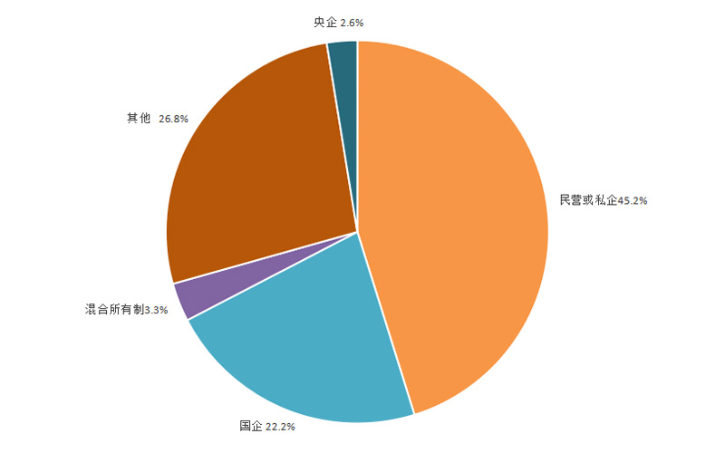 企業(yè)性質(zhì)情況:央企640家,占2.6%;國企5549家,占22.2%;混合所有制企業(yè)813家,占3.3%;民營或私企11295家,占45.2%;其他6702家,占26.8%。
