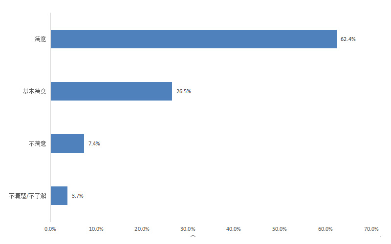 調(diào)查結(jié)果顯示,群眾對政府機(jī)關(guān)工作人員的工作作風(fēng)的滿意度為88.9%,其中評價“滿意”的占62.4%,“基本滿意”的占26.5%,“不滿意”的占7.4%,“不清楚/不了解”的占3.7%。