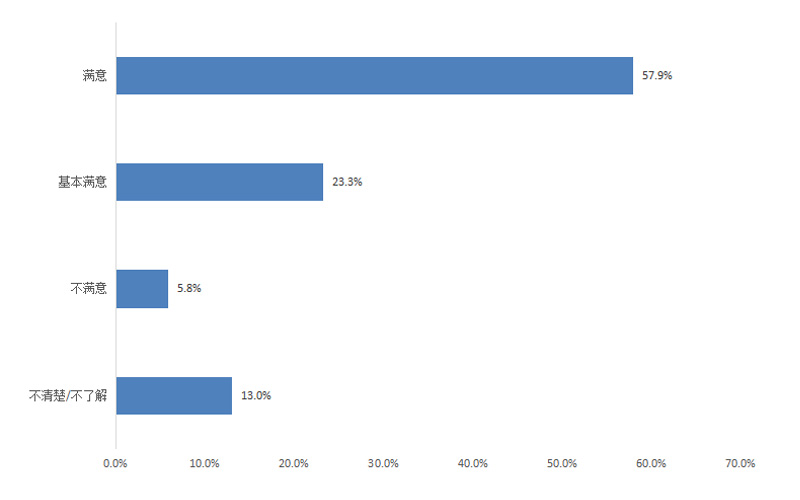 調(diào)查結(jié)果顯示,群眾對政府規(guī)范律師事務(wù)所、行業(yè)協(xié)會等代理中介機(jī)構(gòu)收費(fèi)、耗時等相關(guān)服務(wù)的滿意度為81.2%,其中評價“滿意”的占57.9%,“基本滿意”的占23.3%,“不滿意”的占5.8%,“不清楚/不了解”的占13.0%。