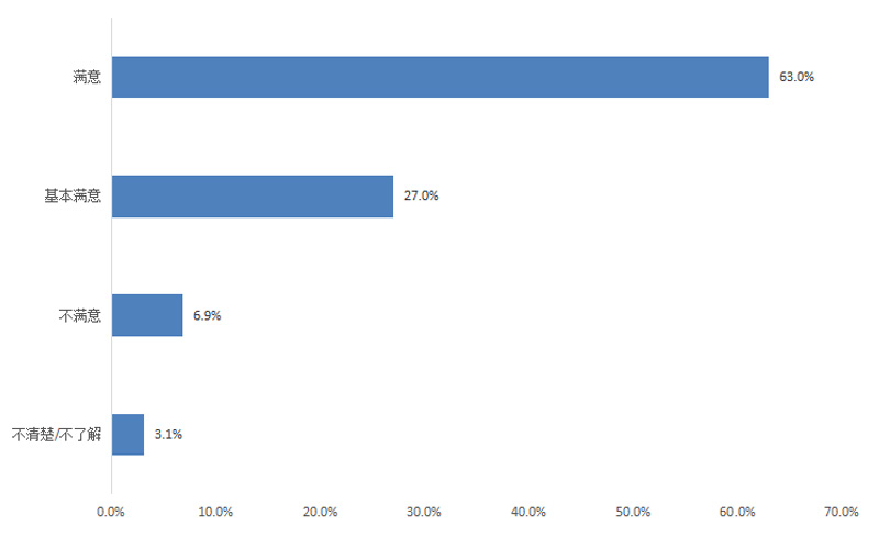 調(diào)查結(jié)果顯示,群眾對居住地行政機(jī)關(guān)執(zhí)法工作的滿意度為90.0%,其中評價“滿意”的占63.0%,“基本滿意”的占27.0%,“不滿意”的占6.9%,“不清楚/不了解”的占3.1%。