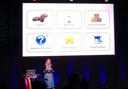 9:40:谷歌副總裁瑪麗莎?梅耶爾(Marissa Mayer)登臺(tái),她首先做了一些簡(jiǎn)要的描述:每周有10億用戶通過(guò)Google搜索。接著她討論了Google搜索的一些新功能。如Google Caffeine,實(shí)時(shí)搜索,時(shí)間軸瀏覽,問(wèn)答功能增強(qiáng)等。