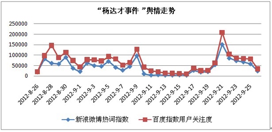 在“楊達(dá)才事件”中,從當(dāng)事人的“微笑”照片被曝光到最終被撤職,歷時近一個月(2012年8月26日——9月26日)。鑒于此,筆者以“楊達(dá)才”為關(guān)鍵字、以此時間段為截點(diǎn)、以“百度指數(shù)”功能和“微指數(shù)”的“熱詞指數(shù)”功能為數(shù)據(jù)庫進(jìn)行歸類統(tǒng)計,作為本研究的基本數(shù)據(jù)來源。