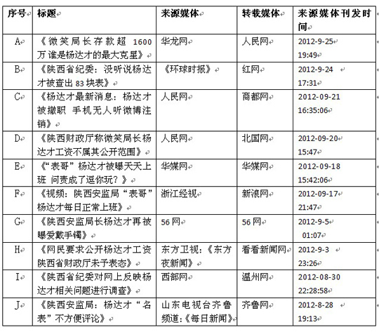 9月21日13時10分,陜西省紀(jì)委在其官方網(wǎng)站秦風(fēng)網(wǎng)上發(fā)布了《楊達(dá)才被撤銷省紀(jì)委委員、省安監(jiān)局黨組書記、局長職務(wù)》[7]的聲明,成為2012年9月以來,關(guān)于楊達(dá)才事件的輿論制高點(diǎn)。