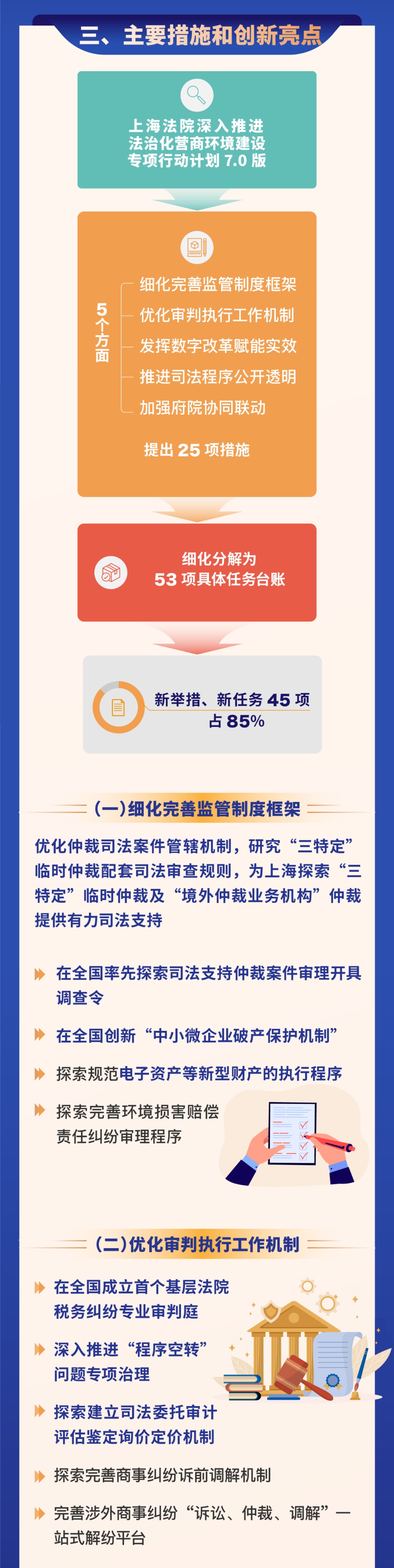 市高院近日印發(fā)《上海法院深入推進(jìn)法治化營商環(huán)境建設(shè)專項行動計劃(7.0版)》(以下簡稱上海法院7.0版),標(biāo)志著上海法院法治化營商環(huán)境建設(shè)新一輪工作正式啟動。新舉措、新任務(wù)45項,占85%。包括細(xì)化完善監(jiān)管制度框架、優(yōu)化審判執(zhí)行工作機制、發(fā)揮數(shù)字改革賦能實效、推進(jìn)司法程序公開透明、加強府院協(xié)同聯(lián)動等5方面。圖解詳見↓