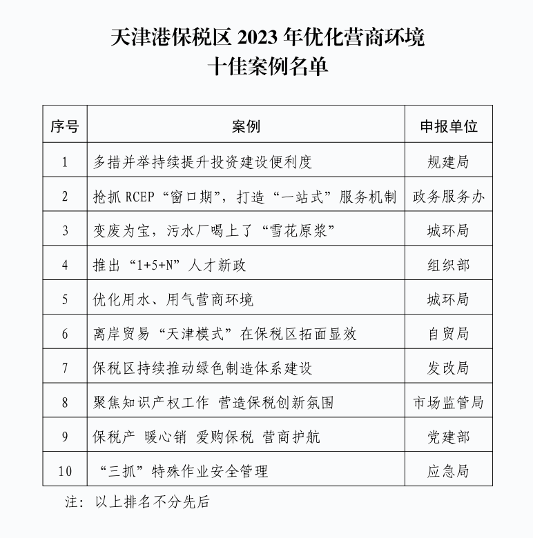 2023年天津港保稅區(qū)堅(jiān)持深入貫徹黨中央、國務(wù)院關(guān)于優(yōu)化營商環(huán)境工作的重要部署,落實(shí)市委市政府“十項(xiàng)行動”工作要求、濱海新區(qū)高質(zhì)量發(fā)展支撐引領(lǐng)行動方案,對標(biāo)國際高標(biāo)準(zhǔn)經(jīng)貿(mào)規(guī)則,進(jìn)一步激發(fā)市場活力,加快打造市場化、法治化、國際化的營商環(huán)境高地,充分釋放營商環(huán)境改革的“生產(chǎn)力效應(yīng)”。