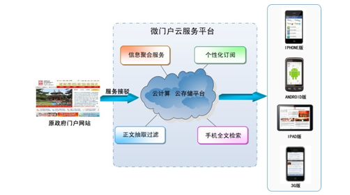 通過云計(jì)算及云存儲(chǔ)技術(shù),快速接駁現(xiàn)有互聯(lián)網(wǎng)政府信息公開平臺(tái),以標(biāo)準(zhǔn)接口和移動(dòng)客戶端界面開發(fā)調(diào)用現(xiàn)有平臺(tái)數(shù)據(jù),實(shí)現(xiàn)政府信息公開方式,在不需要投入硬件的前提下,完成網(wǎng)站信息公開內(nèi)容在手機(jī)終端上的展現(xiàn)。
