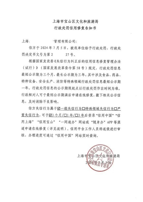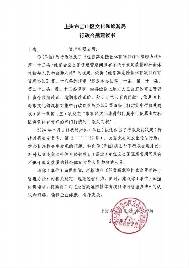 今年7月5日,寶山區(qū)文化和旅游局依照“誰處罰、誰負責”原則,“點對點”向區(qū)內(nèi)一家酒店管理公司送達首份“三書”,當事人因違反《經(jīng)營高危險性體育項目許可管理辦法》相關規(guī)定被區(qū)文旅局執(zhí)法大隊處以罰款,除《行政處罰決定書》一并送達的還有《行政合規(guī)建議書》和《信用修復告知書》。