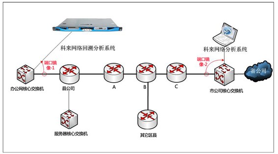將科來(lái)網(wǎng)絡(luò)回溯分析系統(tǒng)旁路接入到縣公司信息內(nèi)網(wǎng)的核心交換機(jī)上,由于故障發(fā)生的間歇性需要對(duì)縣公司到市公司的主干出口流量做長(zhǎng)時(shí)間捕獲。并利用科來(lái)網(wǎng)絡(luò)分析系統(tǒng)不間斷的捕獲市公司核心交換機(jī)與C路由器的下行接口流量。利用對(duì)比分析法,在故障發(fā)生時(shí)段,分別對(duì)兩處捕獲到的流量做精確分析。