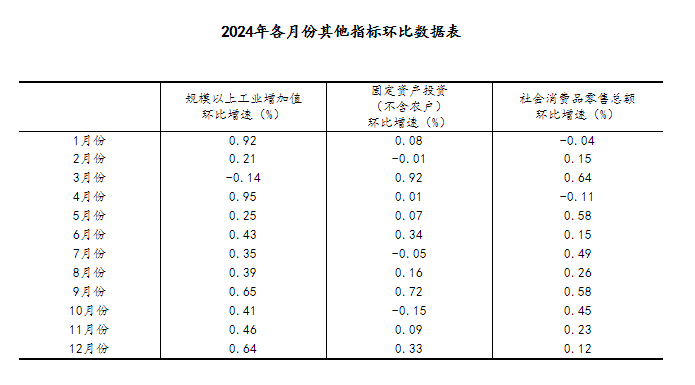 (2)根據(jù)季節(jié)調(diào)整模型自動修正結(jié)果,對近一年來各期國內(nèi)生產(chǎn)總值、規(guī)模以上工業(yè)增加值、固定資產(chǎn)投資(不含農(nóng)戶)、社會消費(fèi)品零售總額環(huán)比增速進(jìn)行修訂。修訂結(jié)果及2024年四季度GDP環(huán)比數(shù)據(jù)、2024年12月份其他指標(biāo)環(huán)比數(shù)據(jù)如下: