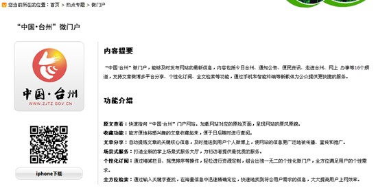 2013年,“中國·臺州”微門戶打造了智慧政府和電子政務(wù)云計算的創(chuàng)新典型,為市民提供最有用、最快捷、最方便的政府服務(wù),并成為市民隨身攜帶的政府服務(wù)手冊。這款應(yīng)用支持IPHONE、IPAD、Android等操作系統(tǒng)的各類移動終端。還支持微博推送分享、文章收藏、個性化訂閱、全文檢索等功能,為公眾提供更快捷的服務(wù)。此外,微門戶還支持微博推送分享、文章收藏、個性化訂閱、全文檢索等功能,為公眾提供更快捷的服務(wù)。為此,大會為“中國·臺州”門戶網(wǎng)站頒發(fā)了應(yīng)用創(chuàng)新獎。