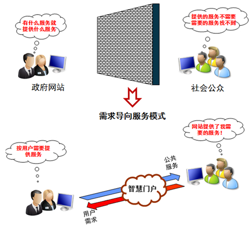 第二,智慧政府門(mén)戶的服務(wù)模式是以用戶需求為導(dǎo)向。政府網(wǎng)站是服務(wù)社會(huì)公眾的重要平臺(tái),用戶需求是網(wǎng)站服務(wù)供給的基本指向,智慧政府門(mén)戶彌補(bǔ)了傳統(tǒng)“供給導(dǎo)向”服務(wù)模式的弊端,開(kāi)啟“需求導(dǎo)向”的服務(wù)新模式,如圖1所示;