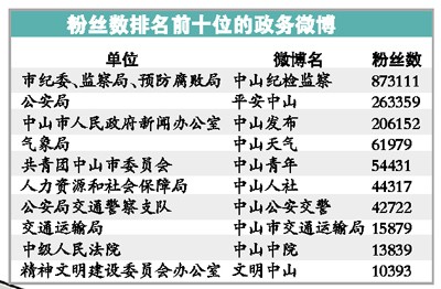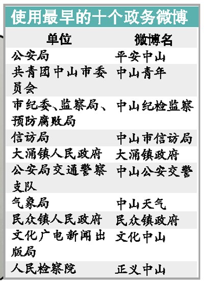目前全市的24個(gè)鎮(zhèn)區(qū)的官方微博已全面上線,而市政府直屬的34個(gè)部門中,除中山市人民政府辦公室外,還有市財(cái)政局、市公安消防局、市體育局、市審計(jì)局、市公路局、市統(tǒng)計(jì)局等6個(gè)部門沒有官方微博上線。