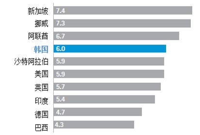 韓國民眾感到政府應(yīng)改進工作質(zhì)量。在WEF的全球競爭力排名2012-2013中,韓國在政府決策透明度排名中位列133(共144個國家參加排名),在本次調(diào)查的十國中排名最后。