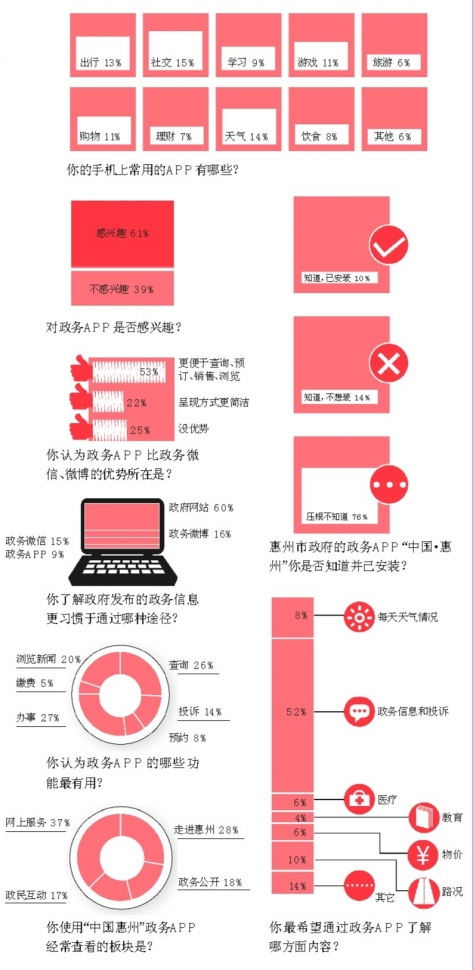 近期惠州市政府上線的“中國·惠州”A PP共設(shè)置了四大板塊———“走進(jìn)惠州”、“政務(wù)公開”、“政民互動”、“網(wǎng)上服務(wù)”,涵蓋了政府信息發(fā)布、新聞瀏覽、查詢等功能。雖然功能基本能夠滿足民眾的需求,不過在本次調(diào)查中只有一成的受訪者表示自己已經(jīng)安裝了該APP,另有近八成的受訪者對于這個APP壓根不知道。