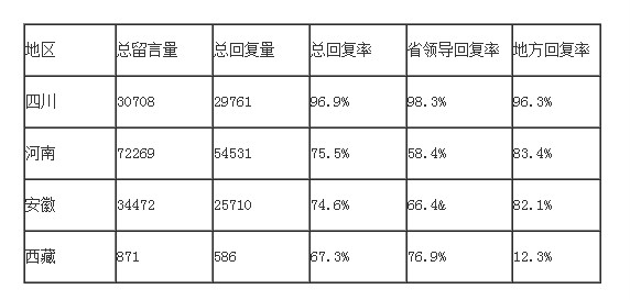 筆者對留言板上各地區(qū)總留言量、總回復(fù)量的統(tǒng)計顯示,四川、河南、安徽三省在總回復(fù)率、領(lǐng)導(dǎo)回復(fù)率、地方回復(fù)率的排名中均位列前四位。可以初步認定,這三個省網(wǎng)民對平臺的關(guān)注度、地方政府的重視程度相對較高,平臺運行績效相對較好。在選擇案例研究時,筆者也將主要從此三省的留言處理案例中進行選擇并分析。下表列出了總回復(fù)率排名前4位地區(qū)的幾項數(shù)據(jù)(篇幅有限,其他地區(qū)不在此列出)