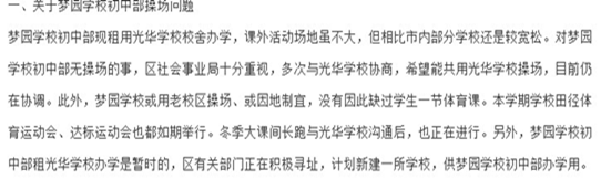 這則留言最后將矛頭指向高新區(qū)對于教育投入的不足,并根據(jù)《中華人民共和國義務(wù)教育法》指出高新區(qū)管委會在學(xué)校規(guī)劃和設(shè)置事項上的不作為。2月17日,高新區(qū)工委辦公室在網(wǎng)上回復(fù),表示由管委會出資租用光華學(xué)校操場用于夢園學(xué)校辦學(xué)。