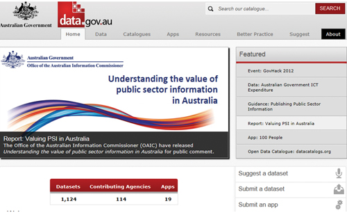 澳大利亞政府?dāng)?shù)據(jù)網(wǎng)站(Data.gov.au)為查找、訪問和重用來自澳大利亞政府、州政府和領(lǐng)地政府的公共數(shù)據(jù)集提供了一個(gè)簡單的方法。Data.gov.au網(wǎng)站是依據(jù)澳大利亞政府的《開放政府申明》,應(yīng)政府2.0工作組的要求而建立的,由澳大利亞金融和放松管制部負(fù)責(zé)它的發(fā)展和持續(xù)運(yùn)營。