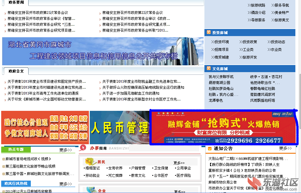 5月25日,網(wǎng)民“黃州總督”在東湖社區(qū)麻城論壇發(fā)帖,反映麻城市政府網(wǎng)首頁出現(xiàn)多幅商業(yè)廣告,其中,涉及某地產(chǎn)企業(yè)冠名的歌手大獎(jiǎng)賽,甚至還有某商鋪“熱銷”廣告。