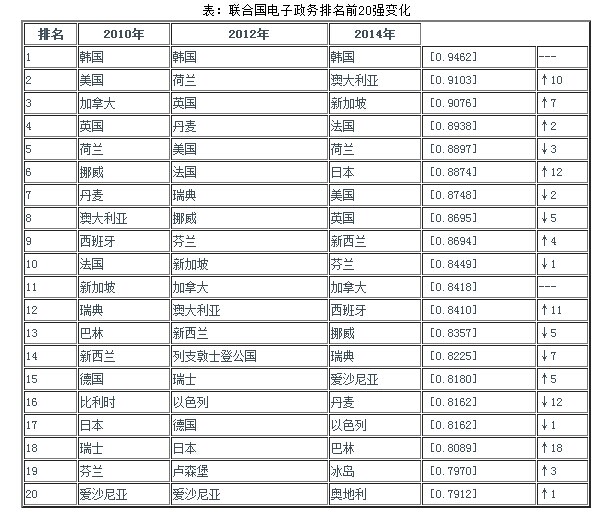 2014年國(guó)名的右側(cè)為得分(EGDI:e-government development index)和相較于2012年的排名變化