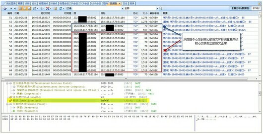 在校園網(wǎng)核心交換處通過科來回溯分析系統(tǒng)采集的數(shù)據(jù)包,我們通過TCP會話視圖可以看到從數(shù)據(jù)中心發(fā)過來的數(shù)據(jù)包的TCP序列號兩兩重復(fù),而且間隔時間非常短,從核心交換發(fā)往數(shù)據(jù)中心的數(shù)據(jù)包則沒有出現(xiàn)這種情況。這一現(xiàn)象可以排除TCP重傳的可能性,因?yàn)槌瑫r重傳需要等待兩倍RTT延時,發(fā)送方不可能如此短的時間間隔重傳數(shù)據(jù)包。