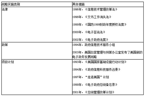 整體而言,美國電子政府發(fā)展過程中使用過的基本策略,依據(jù)戰(zhàn)略實(shí)施類別分類,具體如下: