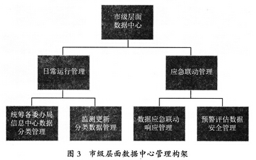 市級層面數(shù)據(jù)中心管理構(gòu)架(如圖3),主要分為日常運(yùn)行管理及應(yīng)急聯(lián)動管理兩類,制定統(tǒng)一數(shù)據(jù)信息安全管理標(biāo)準(zhǔn)、信息數(shù)據(jù)標(biāo)準(zhǔn)化格式。同時明確數(shù)據(jù)使用、數(shù)據(jù)安全、數(shù)據(jù)發(fā)布、相關(guān)者的權(quán)力、法律保護(hù)、監(jiān)管機(jī)構(gòu)、對數(shù)據(jù)的特殊使用、特殊使用的種類、處罰規(guī)定、過渡和最終規(guī)定等。