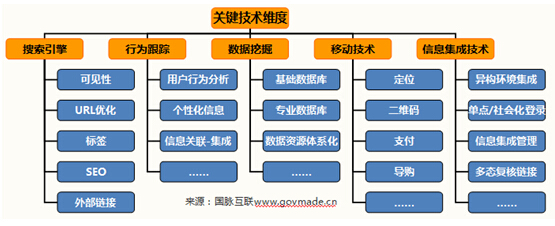 關(guān)鍵技術(shù)是政府網(wǎng)站發(fā)展建設(shè)的支撐,是突破政府網(wǎng)站建設(shè)瓶頸,提升政府網(wǎng)站應(yīng)用績(jī)效,創(chuàng)新政府網(wǎng)站服務(wù)模式的主要途徑,包括搜索引擎技術(shù)、行為跟蹤技術(shù)、數(shù)據(jù)挖掘技術(shù)、移動(dòng)技術(shù)、信息集成技術(shù)5個(gè)要素。