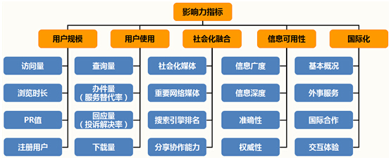 影響力是衡量政府網(wǎng)站對(duì)政府形象塑造、政府工作績(jī)效支撐度的重要指標(biāo),圍繞用戶的視角、生態(tài)的視角、權(quán)威的視角、國(guó)際的視角,其考評(píng)維度可以從“用戶規(guī)模、用戶使用、社會(huì)化融合、信息可用性、國(guó)際化”5個(gè)方面來展開。