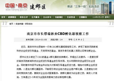 1月8日的報(bào)道《南京市市長(zhǎng)繆瑞林來(lái)CBD孵化器視察工作》