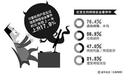 計(jì)算機(jī)用戶發(fā)生過(guò)信息網(wǎng)絡(luò)安全事件的比例較上一年上升17。9%,感染病毒、木馬仍然是用戶面臨的最主要威脅。