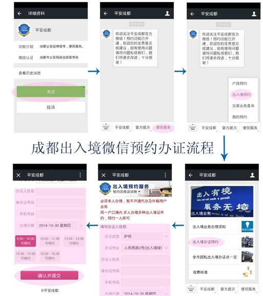 出入境微信預(yù)約辦證服務(wù)平臺以成都市公安局推出的“平安成都”微信為依托,操作方便快捷。申請人只需關(guān)注成都市公安局官方微信“平安成都”,點擊進入便民服務(wù)中的出入境辦證預(yù)約,并填寫相關(guān)信息、選擇預(yù)約時段,預(yù)約成功后申請人便可在預(yù)約時間內(nèi)前往出入境接待中心辦理相關(guān)證件,大大減少了申請人等候時間,為申請人提供了便利。