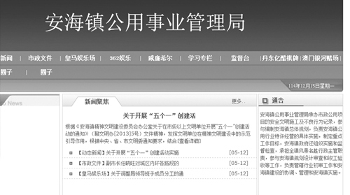 記者點開鏈接,乍一看,像是個正規(guī)網(wǎng)站,仔細一瞧,發(fā)現(xiàn)這個頁面無論是網(wǎng)站結構還是美工程度都比較粗糙。頁面正上方有著大大的“安海鎮(zhèn)公用事業(yè)管理局”幾個字,下面一欄導航中有十個小欄目,其中包括“動態(tài)新聞”、“市政文件”等,令人咋舌的是,竟然還有“皇馬娛樂場”、“丹東億酷棋牌”、“澳門銀河賭場”等欄目。記者試著打開“皇馬娛樂場”欄目,跳出的是一個充滿各種賭場廣告和賭博信息的網(wǎng)站。