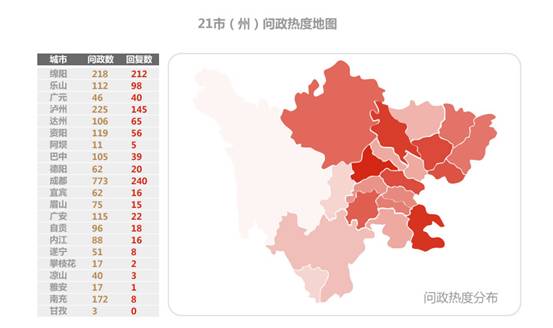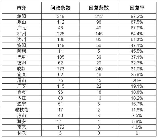 問政回復率:成都網(wǎng)友問政最熱情 綿陽回復率最高