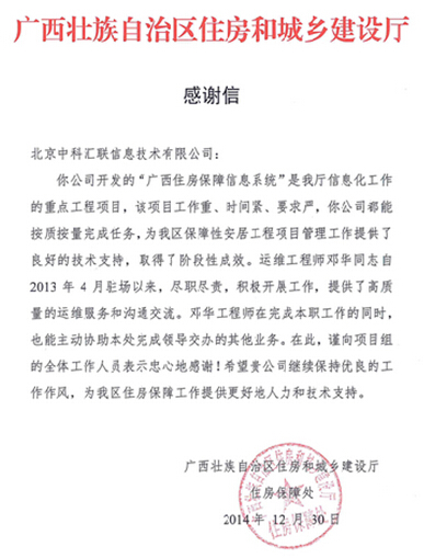 中科匯聯2014年末驚喜不斷,繼上次獲得深圳龍華新區(qū)感謝信后,再次獲得廣西壯族自治區(qū)住房和城鄉(xiāng)建設廳(以下簡稱建設廳)感謝信。建設廳為表彰中科匯聯在"廣西住房信息保障系統(tǒng)"項目中,在項目工作中、時間緊、要求嚴的重重困難下,按質按量完成項目工作,特此發(fā)來感謝信。