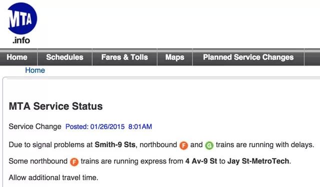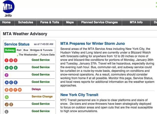 假設(shè)你是一個(gè)紐約市民,早上起來(lái)看到暴風(fēng)雪,想知道自己上班坐的地鐵和公交車是不是還在正常運(yùn)行,那么你可以點(diǎn)開交通管理部門“大都會(huì)運(yùn)輸署”的網(wǎng)站。這個(gè)網(wǎng)站略顯簡(jiǎn)陋,但是在首頁(yè)一眼就能看到地鐵、公交車、鐵路、橋梁和隧道的運(yùn)行狀況。