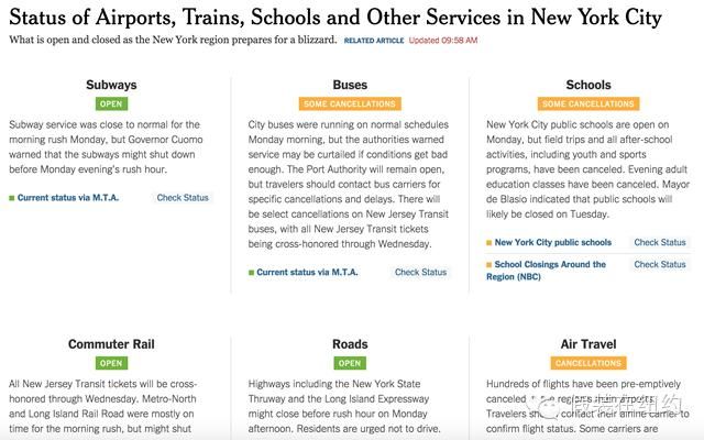 不過(guò)我今天要說(shuō)的并不是這場(chǎng)雪,而是在《紐約時(shí)報(bào)》網(wǎng)站上看到的這個(gè)頁(yè)面,上面列出了各個(gè)政府管理部門的專門網(wǎng)頁(yè),點(diǎn)進(jìn)去就能看到各種公共服務(wù)的實(shí)時(shí)狀態(tài)更新。