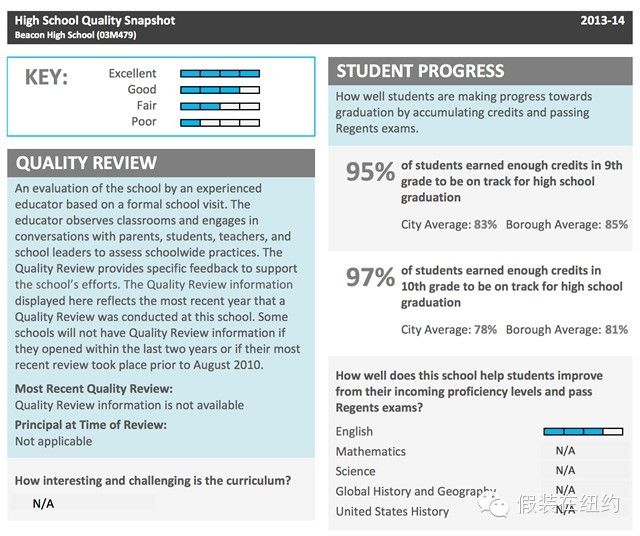 我們點(diǎn)開其中的一所學(xué)校,燈塔高中(Beacon High School)的頁(yè)面,上面除了各種基本信息、介紹和聯(lián)系方式以外,最重要的,仍然是一份PDF文檔,上面詳細(xì)載明了這個(gè)學(xué)校在上一學(xué)年的各項(xiàng)統(tǒng)計(jì)數(shù)據(jù),非常詳盡。比如燈塔高中的統(tǒng)計(jì)報(bào)告上就可以看到,該校上一學(xué)年95%的9年級(jí)學(xué)生成績(jī)合格,而同期全市的平均合格率是83%,該校所在的布魯克林區(qū)的平均合格率則是85%。當(dāng)然,每一所學(xué)校都一定會(huì)有這樣一份統(tǒng)計(jì)數(shù)據(jù)??上攵獙?duì)于學(xué)生家長(zhǎng)來(lái)說(shuō),這些數(shù)據(jù)是多么重要。
