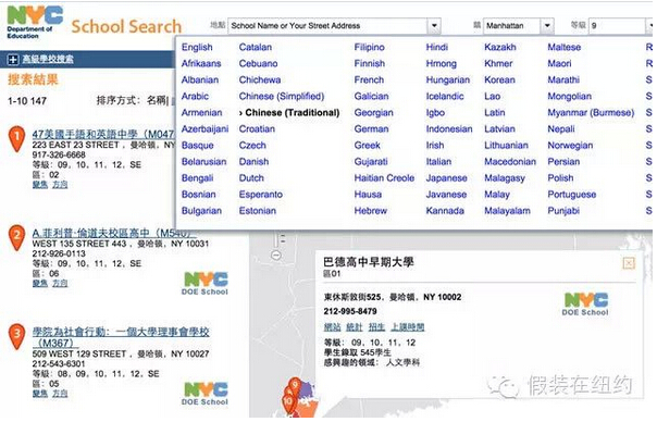 查完警察局,我們?cè)賮?lái)看看教育局(Department of Education, 簡(jiǎn)稱DOE)的情況。不出意外地,教育局的網(wǎng)站上可以方便地查到所有的學(xué)校,并且可以根據(jù)地址、區(qū)域、年級(jí)等多個(gè)條件進(jìn)行檢索,而且還提供了91種語(yǔ)言的翻譯(這個(gè)也是沒(méi)辦法,紐約就是有這么多種族和國(guó)家的人啊)。