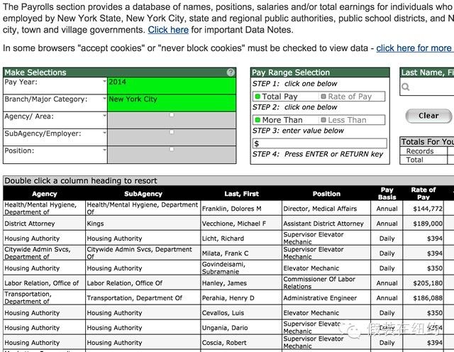 毫不夸張地說(shuō),在美國(guó)這個(gè)國(guó)家,所有的信息都是透明的。普通人想查詢?nèi)魏喂彩聞?wù)方面的數(shù)據(jù),都可以非常方便地查到。比如政府部門每一個(gè)工作人員每一年的薪酬?duì)顩r。在下面這個(gè)網(wǎng)站上,我查到了房屋局的電梯維修工Luis Cevallos的日薪是350美元,而勞動(dòng)關(guān)系處處長(zhǎng)James Hanley在2014年的年薪則是205180美元。