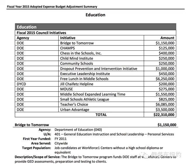 最讓人嘆為觀止的還是預(yù)算。通過(guò)搜索,我?guī)缀醪毁M(fèi)吹灰之力地查到了紐約市議會(huì)網(wǎng)站上公布的2015財(cái)年的預(yù)算,這是一個(gè)有292頁(yè)的巨大文檔,上面巨細(xì)無(wú)遺地列舉了分配給每一個(gè)市議員、每一個(gè)民間機(jī)構(gòu)的每一筆錢,以及這筆錢的金額和用途。比如我看到一個(gè)叫做“韓裔美國(guó)人家庭服務(wù)中心”的非營(yíng)利組織就申請(qǐng)到了3900美元,這筆錢用于雇傭能說(shuō)韓語(yǔ)和懂韓國(guó)文化的工作人員,為韓裔家庭暴力受害者提供幫助,協(xié)助申請(qǐng)到這筆錢的是市議員Daniel Dromm。在這個(gè)文檔里,這樣的條目大概有成千上萬(wàn),小到幾百、幾千美元,多到幾萬(wàn)幾十萬(wàn)美元,每一筆預(yù)算都能像這樣找到出處。
