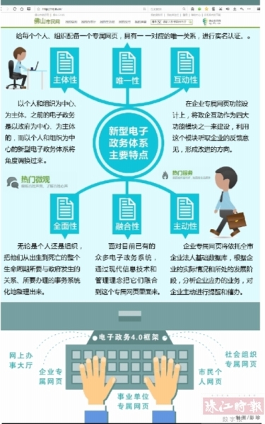 珠江時報訊 想找政府辦事,但是不知道由什么部門負(fù)責(zé)怎么辦?今后,這樣的困難將有望得到解決。昨日,佛山市經(jīng)濟(jì)和信息化局召開以個人和組織為中心的新型電子政務(wù)體系暨企業(yè)專屬網(wǎng)頁啟動新聞發(fā)布會。該局副局長謝國高表示,我市將建設(shè)電子政務(wù)4.0,個人或組織都將有自己專屬辦事頁面,里面囊括了個人和組織要到政府辦理的所有事項(xiàng),以及辦理渠道。